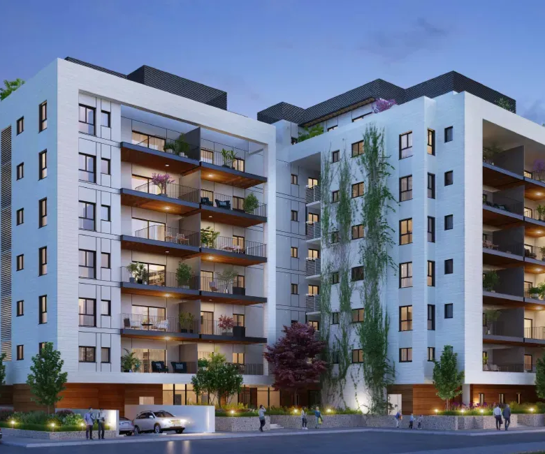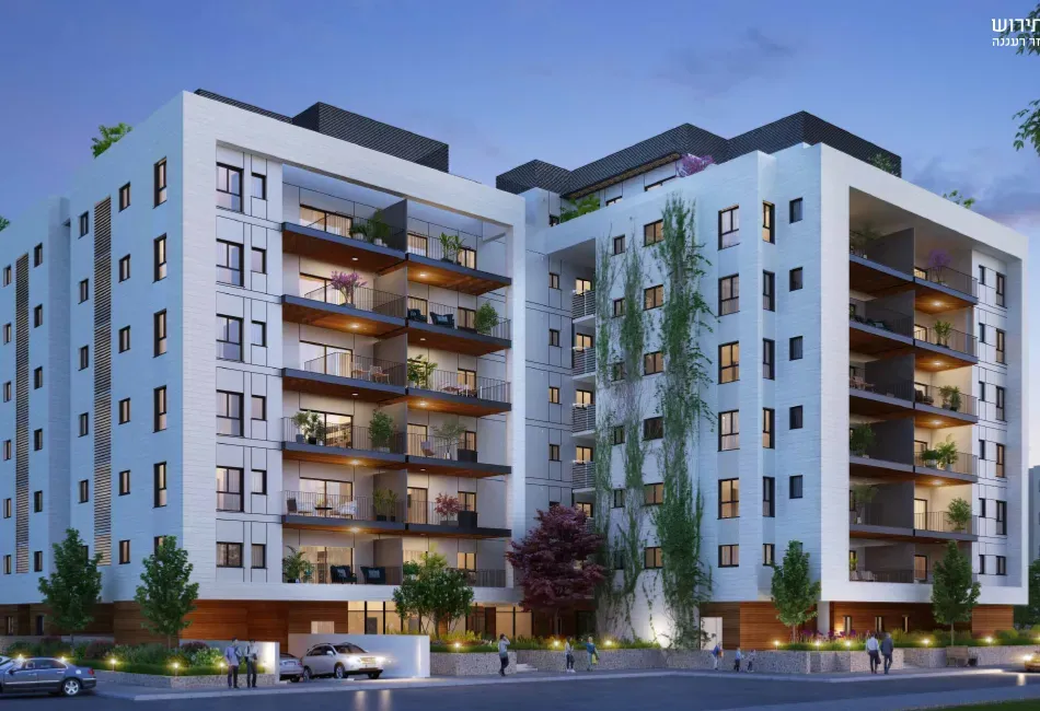 Erez–Tirosh Complex – David Elazar, Ra’anana | The Erez–Tirosh residential complex is a unique development of five boutique buildings located in a quiet villa neighborhood in Ra’anana. The project offers premium 4–6 room apartments, garden units, and penthouses, all designed to provide privacy, open views, and a high level of comfort. Apartments feature smart-home systems, underfloor heating, large terraces, panoramic windows, and two parking spaces. Residents benefit from a private underground parking facility, a residents’ club, bicycle paths, and immediate access to green public gardens and main transportation routes.